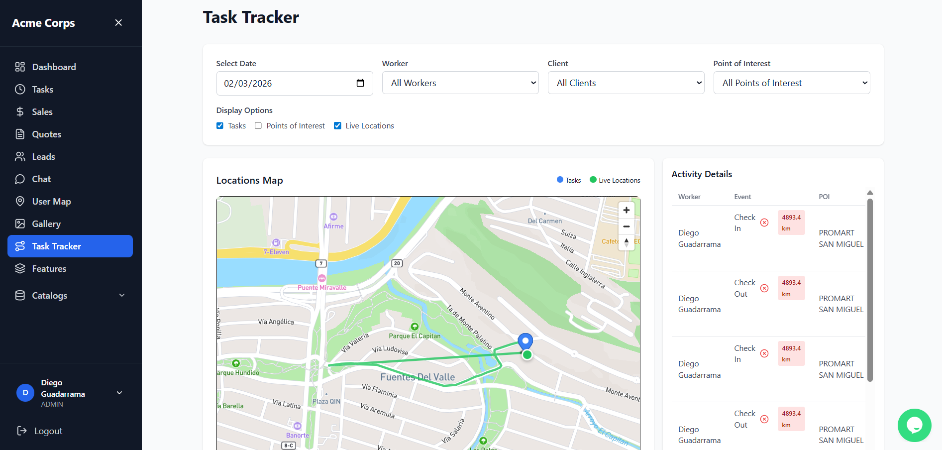 Cada actualización de ubicación, check-in y evento de ruta se sincroniza instantáneamente con tu dashboard de administración. Ve a todo tu equipo en un mapa en vivo, reproduce rutas, descarga reportes y envía mensajes — todo desde un solo lugar.